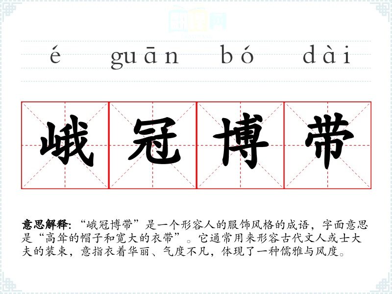 “峨冠博带”是一个形容人的服饰风格的成语,字面意思是“高耸的帽子和宽大的衣带”。它通常用来形容古代文人或士大夫的装束,意指衣着华丽、气度不凡,体现了一种儒雅与风度。