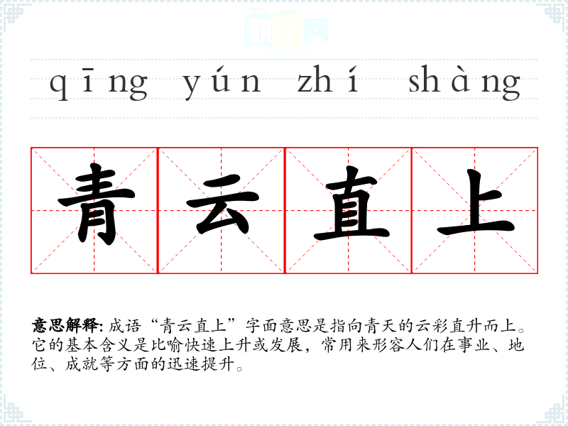 成语“青云直上”字面意思是指向青天的云彩直升而上。它的基本含义是比喻快速上升或发展,常用来形容人们在事业、地位、成就等方面的迅速提升。