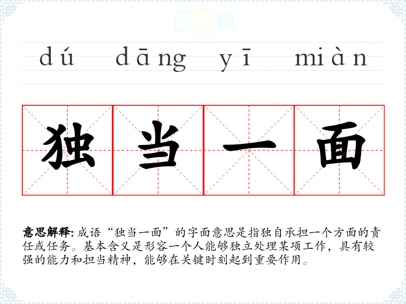 成语“独当一面”的字面意思是指独自承担一个方面的责任或任务。基本含义是形容一个人能够独立处理某项工作,具有较强的能力和担当精神,能够在关键时刻起到重要作用。