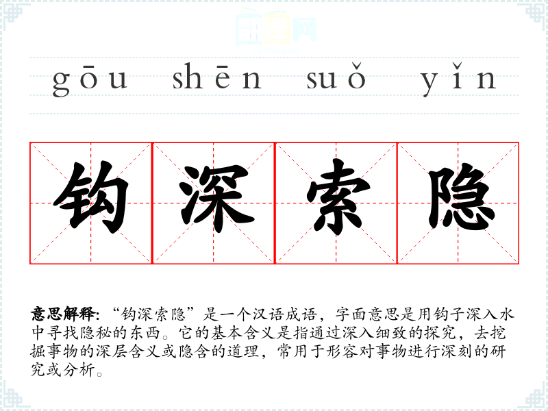 “钩深索隐”是一个汉语成语,字面意思是用钩子深入水中寻找隐秘的东西。它的基本含义是指通过深入细致的探究,去挖掘事物的深层含义或隐含的道理,常用于形容对事物进行深刻的研究或分析。