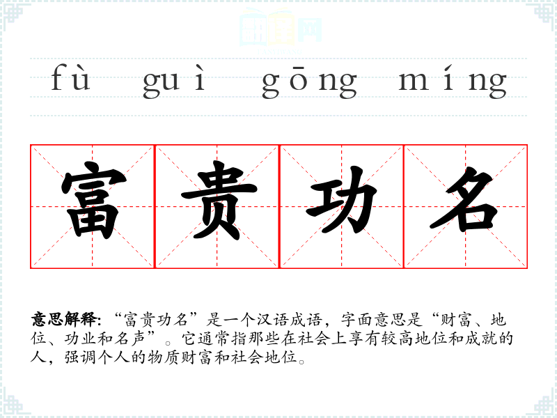 “富贵功名”是一个汉语成语,字面意思是“财富、地位、功业和名声”。它通常指那些在社会上享有较高地位和成就的人,强调个人的物质财富和社会地位。