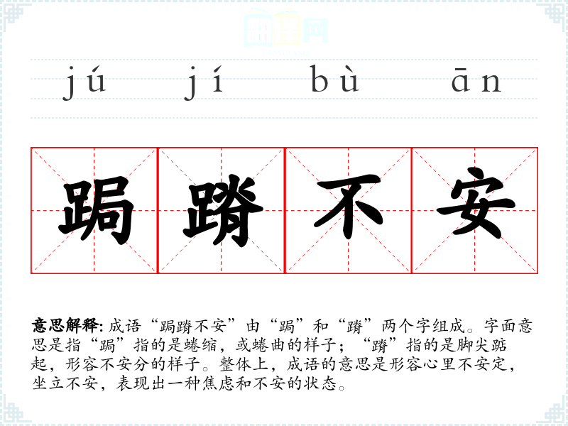 成语“跼蹐不安”由“跼”和“蹐”两个字组成。字面意思是指“跼”指的是蜷缩,或蜷曲的样子;“蹐”指的是脚尖踮起,形容不安分的样子。整体上,成语的意思是形容心里不安定,坐立不安,表现出一种焦虑和不安的状态。