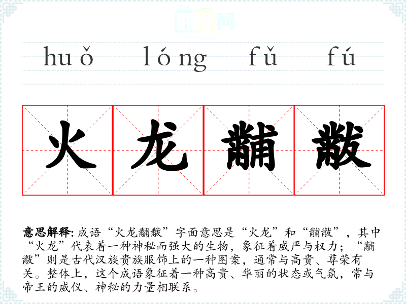 成语“火龙黼黻”字面意思是“火龙”和“黼黻”,其中“火龙”代表着一种神秘而强大的生物,象征着威严与权力;“黼黻”则是古代**贵族服饰上的一种图案,通常与高贵、尊荣有关。整体上,这个成语象征着一种高贵、华丽的状态或气氛,常与帝王的威仪、神秘的力量相联系。