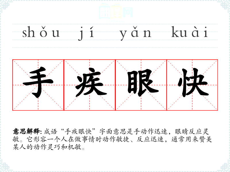 成语“手疾眼快”字面意思是手动作迅速,眼睛反应灵敏。它形容一个人在做事情时动作敏捷、反应迅速,通常用来赞美某人的动作灵巧和机敏。