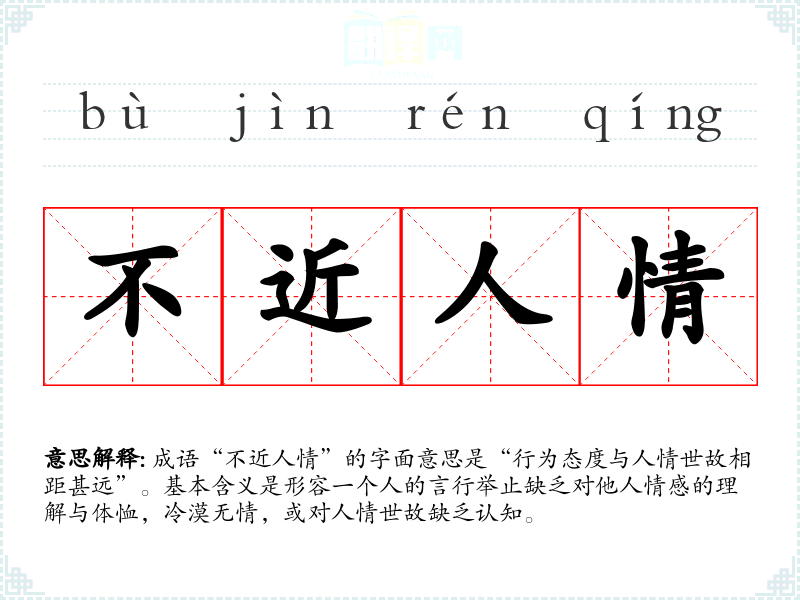 成语“不近人情”的字面意思是“行为态度与人情世故相距甚远”。基本含义是形容一个人的言行举止缺乏对他人情感的理解与体恤,冷漠无情,或对人情世故缺乏认知。