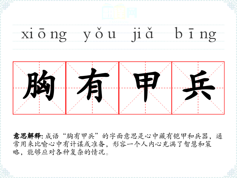成语“胸有甲兵”的字面意思是心中藏有铠甲和兵器,通常用来比喻心中有计谋或准备,形容一个人内心充满了智慧和策略,能够应对各种复杂的情况。
