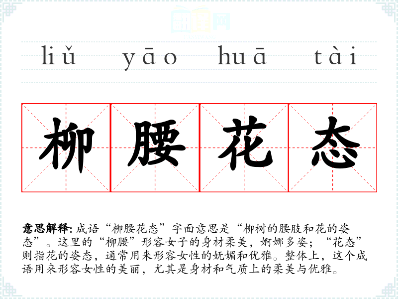 成语“柳腰花态”字面意思是“柳树的腰肢和花的姿态”。这里的“柳腰”形容女子的身材柔美,婀娜多姿;“花态”则指花的姿态,通常用来形容女性的妩媚和优雅。整体上,这个成语用来形容女性的美丽,尤其是身材和气质上的柔美与优雅。