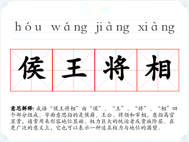 成语“侯王将相”由“侯”、“王”、“将”、“相”四个部分组成。字面意思指的是侯爵、王公、将领和宰相,意指高官显贵,通常用来形容地位显赫、权力巨大的统治者或贵族阶层。在更广泛的意义上,它也可以表示一种追求权力与地位的渴望。