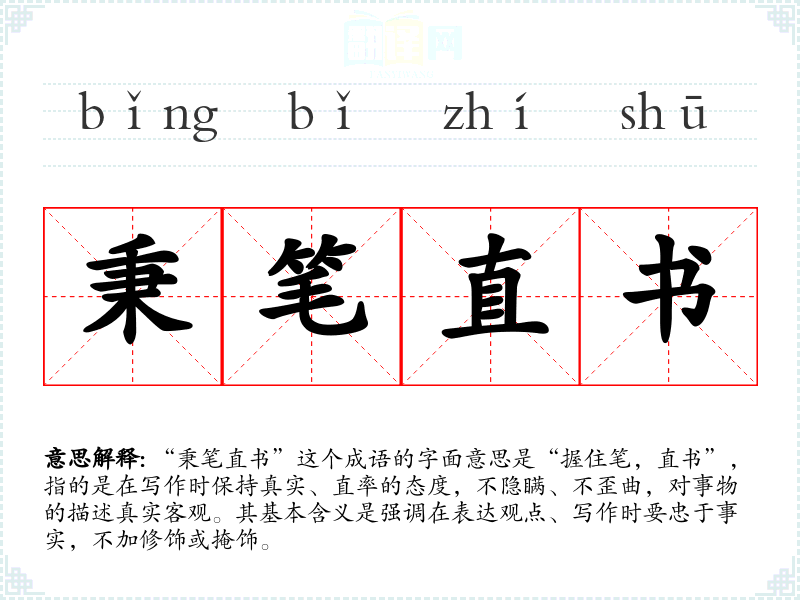 “秉笔直书”这个成语的字面意思是“握住笔,直书”,指的是在写作时保持真实、直率的态度,不隐瞒、不歪曲,对事物的描述真实客观。其基本含义是强调在表达观点、写作时要忠于事实,不加修饰或掩饰。