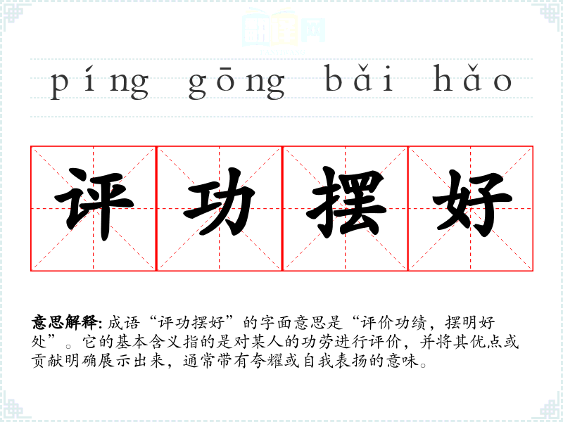 成语“评功摆好”的字面意思是“评价功绩,摆明好处”。它的基本含义指的是对某人的功劳进行评价,并将其优点或贡献明确展示出来,通常带有夸耀或自我表扬的意味。