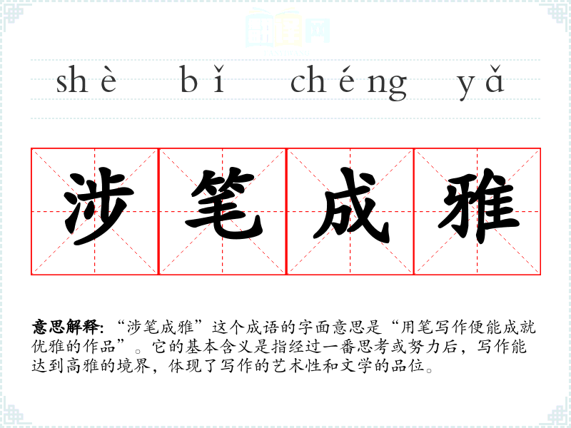 “涉笔成雅”这个成语的字面意思是“用笔写作便能成就优雅的作品”。它的基本含义是指经过一番思考或努力后,写作能达到高雅的境界,体现了写作的艺术性和文学的品位。