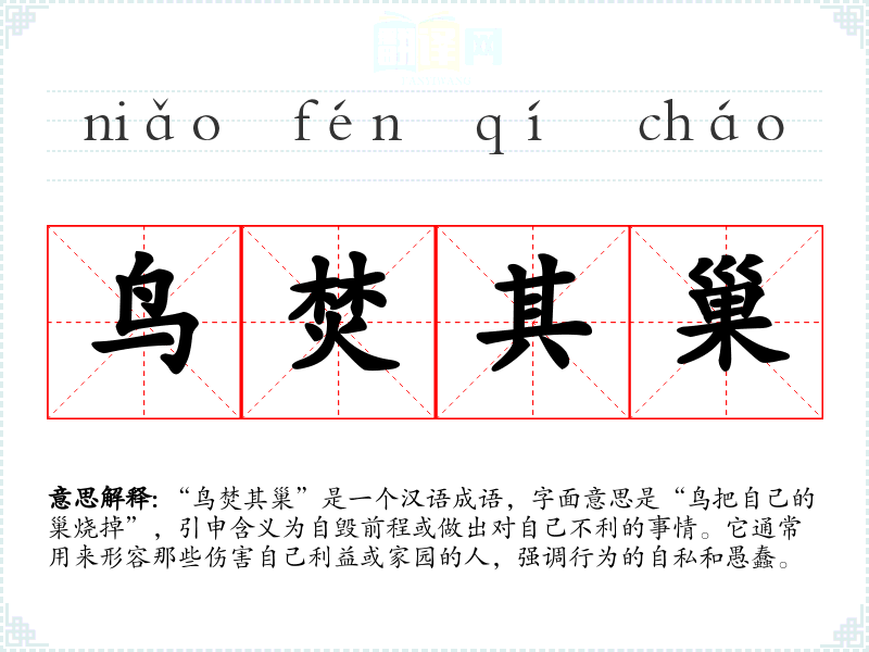 “鸟焚其巢”是一个汉语成语,字面意思是“鸟把自己的巢烧掉”,引申含义为自毁前程或做出对自己不利的事情。它通常用来形容那些伤害自己利益或家园的人,强调行为的自私和愚蠢。