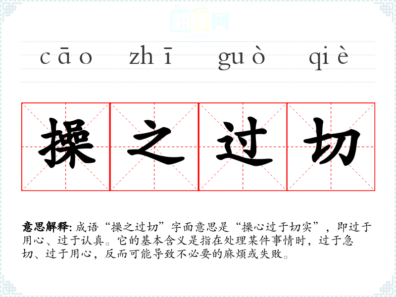 成语“操之过切”字面意思是“操心过于切实”,即过于用心、过于认真。它的基本含义是指在处理某件事情时,过于急切、过于用心,反而可能导致不必要的麻烦或失败。