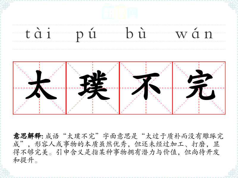 成语“太璞不完”字面意思是“太过于质朴而没有雕琢完成”,形容人或事物的本质虽然优秀,但还未经过加工、打磨,显得不够完美。引申含义是指某种事物拥有潜力与价值,但尚待开发和提升。
