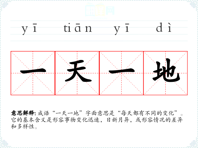 成语“一天一地”字面意思是“每天都有不同的变化”。它的基本含义是形容事物变化迅速,日新月异,或形容情况的差异和多样性。