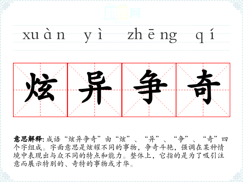 成语“炫异争奇”由“炫”、“异”、“争”、“奇”四个字组成。字面意思是炫耀不同的事物,争奇斗艳,强调在某种情境中表现出与众不同的特点和能力。整体上,它指的是为了吸引注意而展示特别的、奇特的事物或才华。