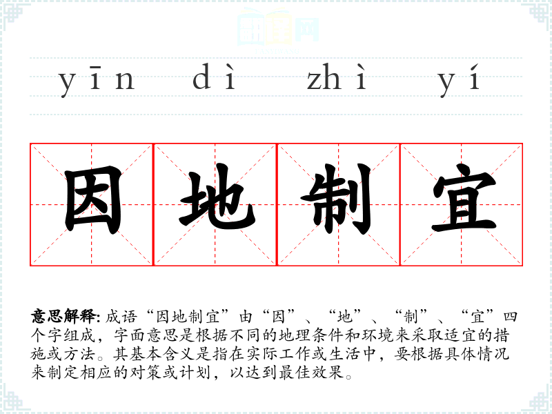 成语“因地制宜”由“因”、“地”、“制”、“宜”四个字组成,字面意思是根据不同的地理条件和环境来采取适宜的措施或方法。其基本含义是指在实际工作或生活中,要根据具体情况来制定相应的对策或计划,以达到最佳效果。