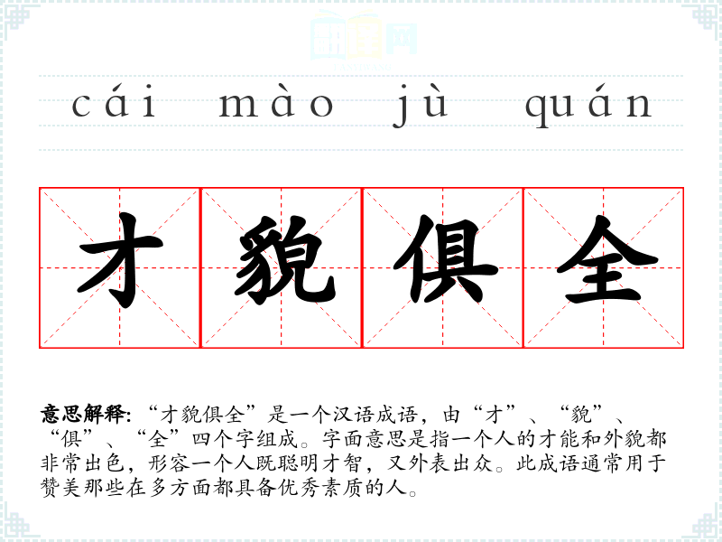 “才貌俱全”在**传统文化中具有重要意义,尤其是在古代,重视外貌和才能的结合是社会对理想人的普遍期待。在现代社会,这一成语仍然适用,但对外貌的要求逐渐被内在素质和综合能力所取代,强调个人的全面发展。