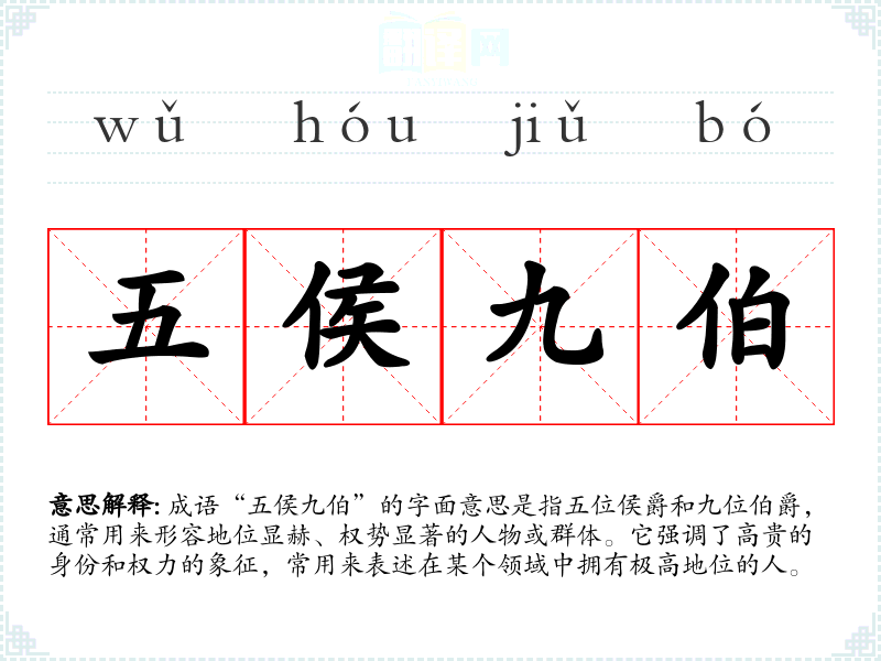 成语“五侯九伯”的字面意思是指五位侯爵和九位伯爵,通常用来形容地位显赫、权势显著的人物或群体。它强调了高贵的身份和权力的象征,常用来表述在某个领域中拥有极高地位的人。