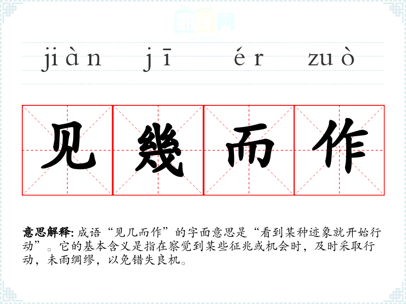 成语“见几而作”的字面意思是“看到某种迹象就开始行动”。它的基本含义是指在察觉到某些征兆或机会时,及时采取行动,未雨绸缪,以免错失良机。