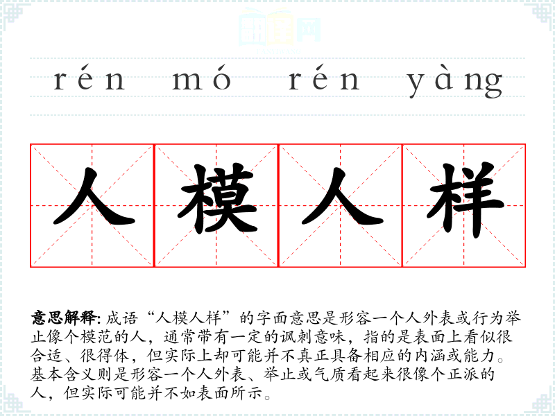 成语“人模人样”的字面意思是形容一个人外表或行为举止像个模范的人,通常带有一定的讽刺意味,指的是表面上看似很合适、很得体,但实际上却可能并不真正具备相应的内涵或能力。基本含义则是形容一个人外表、举止或气质看起来很像个正派的人,但实际可能并不如表面所示。