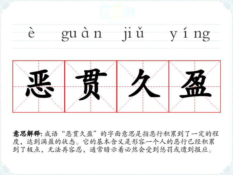 成语“恶贯久盈”的字面意思是指恶行积累到了一定的程度,达到满盈的状态。它的基本含义是形容一个人的恶行已经积累到了极点,无法再容忍,通常暗示着必然会受到惩罚或遭到报应。