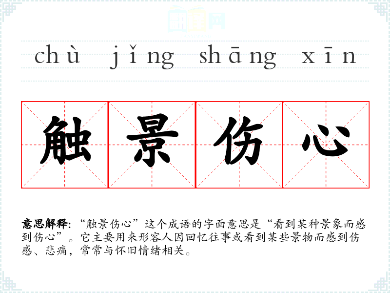 “触景伤心”这个成语的字面意思是“看到某种景象而感到伤心”。它主要用来形容人因回忆往事或看到某些景物而感到伤感、悲痛,常常与怀旧情绪相关。