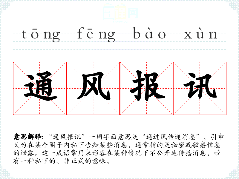 “通风报讯”一词字面意思是“通过风传递消息”,引申义为在某个圈子内私下告知某些消息,通常指的是秘密或敏感信息的泄露。这一成语常用来形容在某种情况下不公开地传播消息,带有一种私下的、非正式的意味。