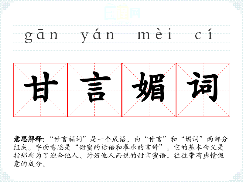 “甘言媚词”是一个成语,由“甘言”和“媚词”两部分组成。字面意思是“甜蜜的话语和奉承的言辞”。它的基本含义是指那些为了迎合他人、讨好他人而说的甜言蜜语,往往带有虚情假意的成分。