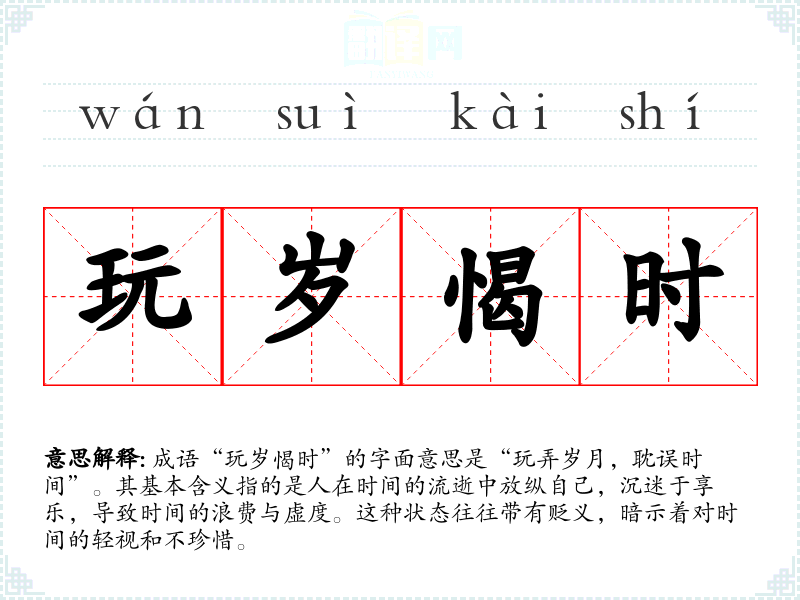 成语“玩岁愒时”的字面意思是“玩弄岁月,耽误时间”。其基本含义指的是人在时间的流逝中放纵自己,沉迷于享乐,导致时间的浪费与虚度。这种状态往往带有贬义,暗示着对时间的轻视和不珍惜。