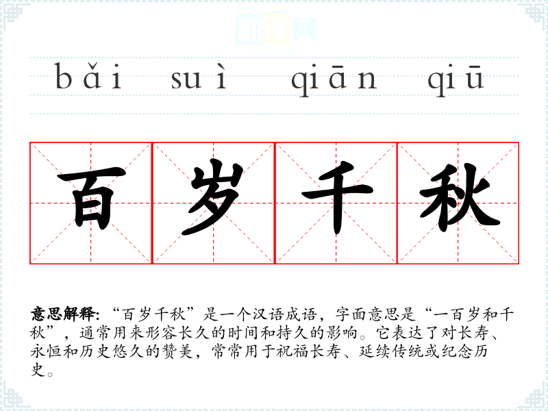 “百岁千秋”是一个汉语成语,字面意思是“一百岁和千秋”,通常用来形容长久的时间和持久的影响。它表达了对长寿、永恒和历史悠久的赞美,常常用于祝福长寿、延续传统或纪念历史。