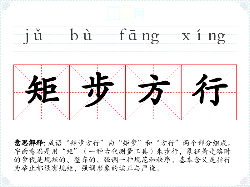 成语“矩步方行”由“矩步”和“方行”两个部分组成。字面意思是用“矩”(一种古代测量工具)来步行,象征着走路时的步伐是规矩的、整齐的,强调一种规范和秩序。基本含义是指行为举止都很有规矩,强调形象的端正与严谨。