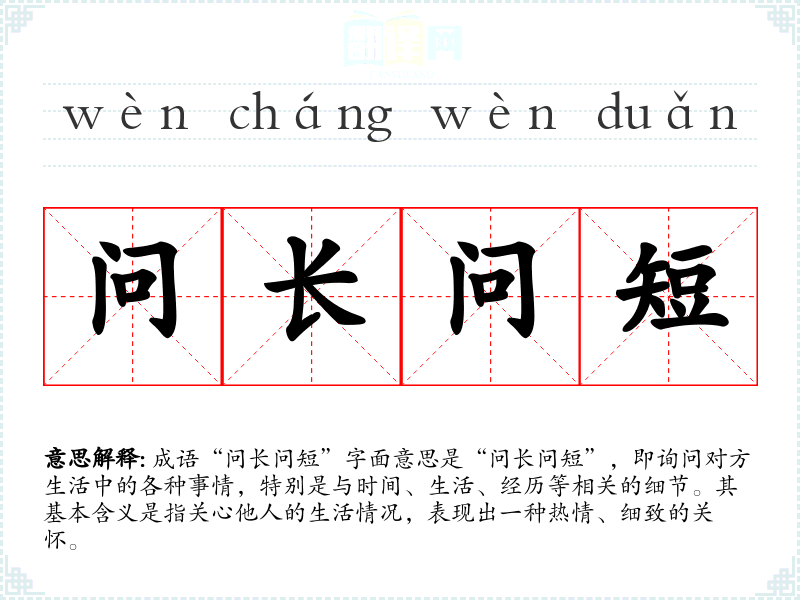 成语“问长问短”字面意思是“问长问短”,即询问对方生活中的各种事情,特别是与时间、生活、经历等相关的细节。其基本含义是指关心他人的生活情况,表现出一种热情、细致的关怀。