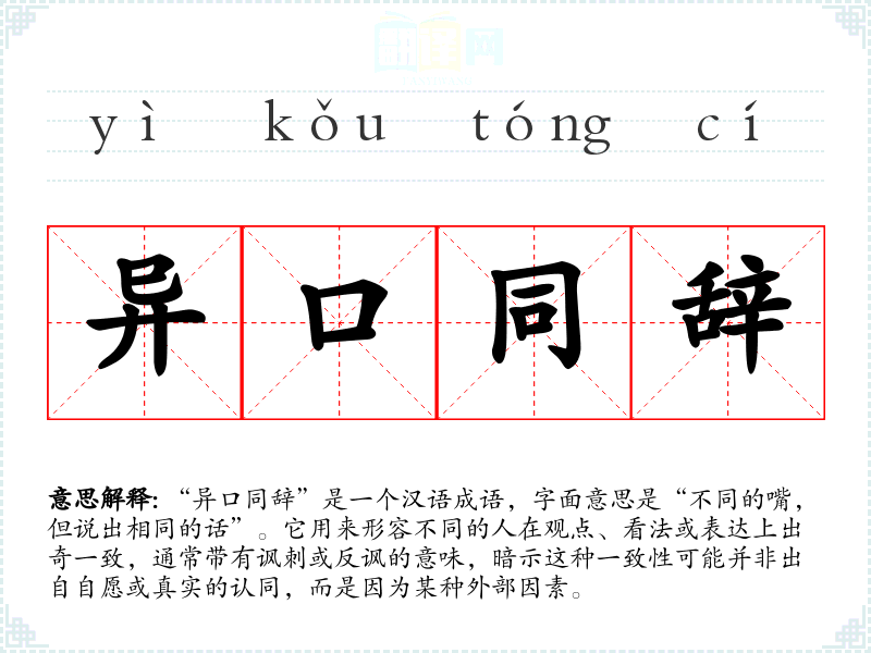 “异口同辞”是一个汉语成语,字面意思是“不同的嘴,但说出相同的话”。它用来形容不同的人在观点、看法或表达上出奇一致,通常带有讽刺或反讽的意味,暗示这种一致性可能并非出自自愿或真实的认同,而是因为某种外部因素。