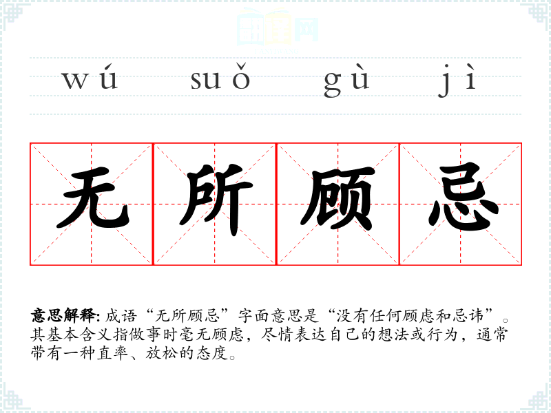 成语“无所顾忌”字面意思是“没有任何顾虑和忌讳”。其基本含义指做事时毫无顾虑,尽情表达自己的想法或行为,通常带有一种直率、放松的态度。
