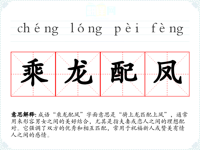 成语“乘龙配凤”字面意思是“骑上龙匹配上凤”,通常用来形容男女之间的美好结合,尤其是指夫妻或恋人之间的理想配对。它强调了双方的优秀和相互匹配,常用于祝福新人或赞美有情人之间的感情。