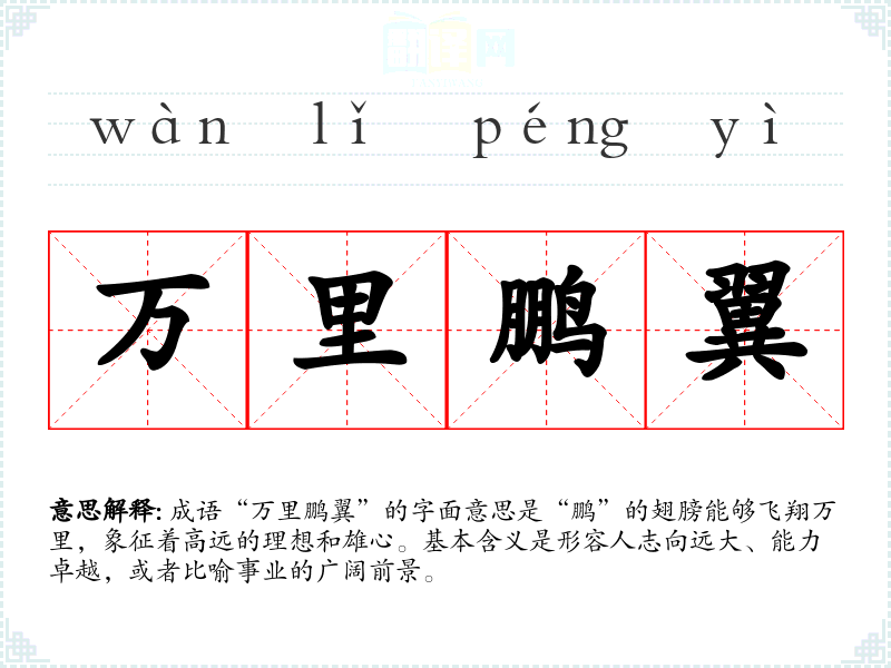 成语“万里鹏翼”的字面意思是“鹏”的翅膀能够飞翔万里,象征着高远的理想和雄心。基本含义是形容人志向远大、能力卓越,或者比喻事业的广阔前景。