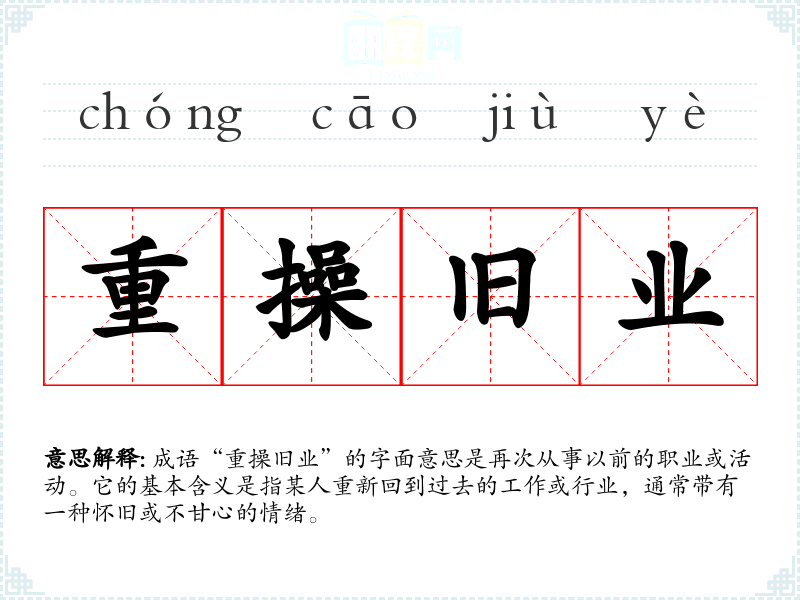 成语“重操旧业”的字面意思是再次从事以前的职业或活动。它的基本含义是指某人重新回到过去的工作或行业,通常带有一种怀旧或不甘心的情绪。