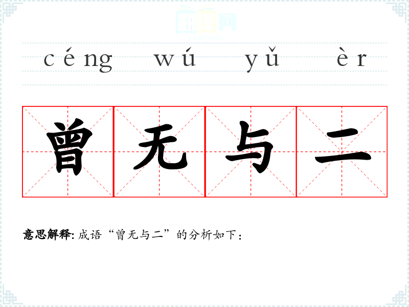 成语“曾无与二”字面意思是“曾经没有与之相等的”。其基本含义是形容某事物或某个人在某一方面是独一无二的,无法与之相比。