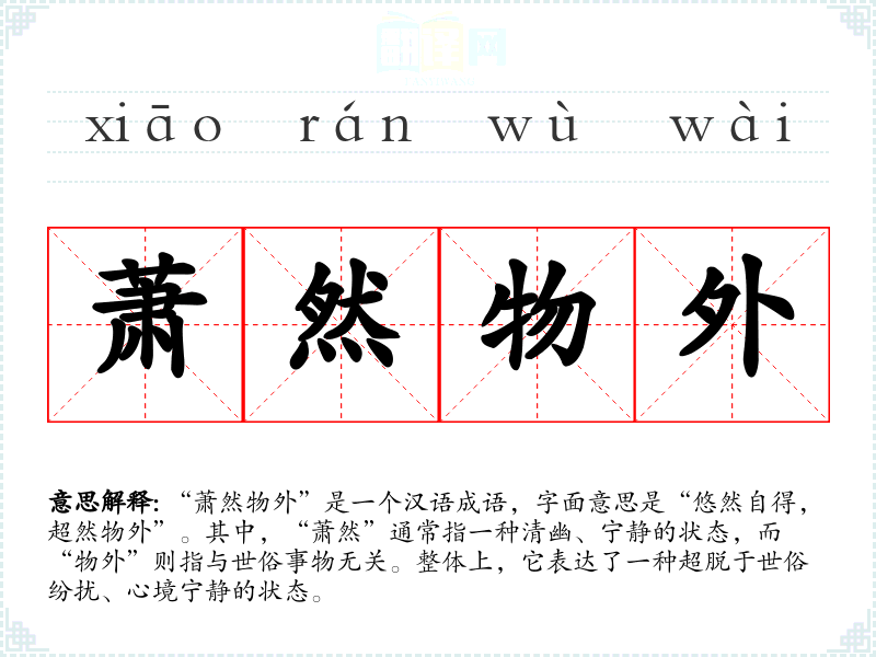 “萧然物外”是一个汉语成语,字面意思是“悠然自得,超然物外”。其中,“萧然”通常指一种清幽、宁静的状态,而“物外”则指与世俗事物无关。整体上,它表达了一种超脱于世俗纷扰、心境宁静的状态。