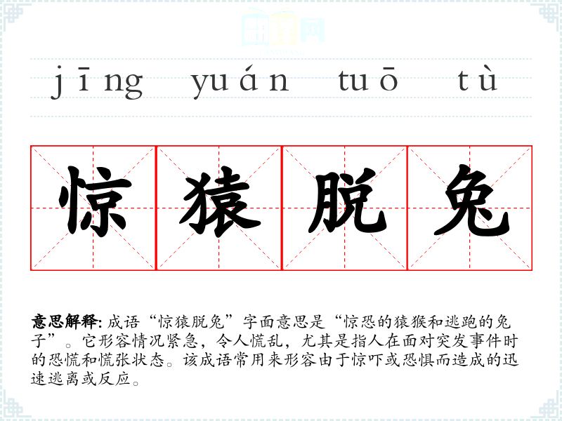 成语“惊猿脱兔”字面意思是“惊恐的猿猴和逃跑的兔子”。它形容情况紧急,令人慌乱,尤其是指人在面对突发**时的恐慌和慌张状态。该成语常用来形容由于惊吓或恐惧而造成的迅速逃离或反应。
