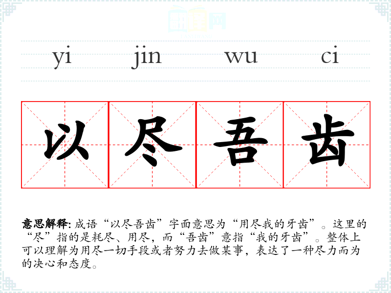 成语“以尽吾齿”字面意思为“用尽我的牙齿”。这里的“尽”指的是耗尽、用尽,而“吾齿”意指“我的牙齿”。整体上可以理解为用尽一切手段或者努力去做某事,表达了一种尽力而为的决心和态度。