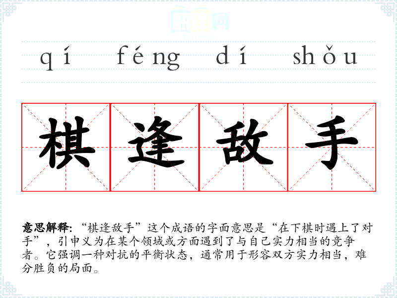 “棋逢敌手”这个成语的字面意思是“在下棋时遇上了对手”,引申义为在某个领域或方面遇到了与自己实力相当的竞争者。它强调一种对抗的平衡状态,通常用于形容双方实力相当,难分胜负的局面。