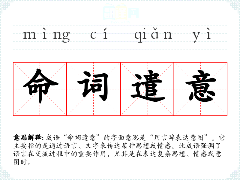 成语“命词遣意”的字面意思是“用言辞表达意图”。它主要指的是通过语言、文字来传达某种思想或情感。此成语强调了语言在交流过程中的重要作用,尤其是在表达复杂思想、情感或意图时。