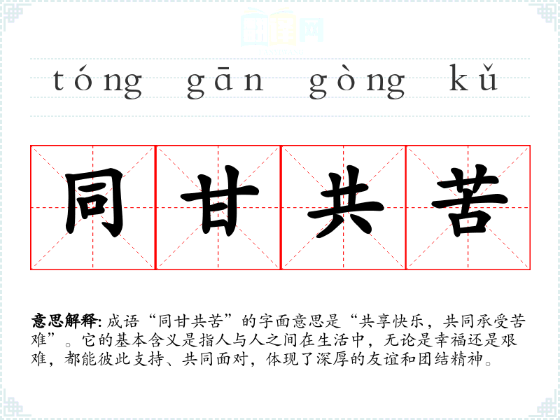成语“同甘共苦”的字面意思是“共享快乐,共同承受苦难”。它的基本含义是指人与人之间在生活中,无论是幸福还是艰难,都能彼此支持、共同面对,体现了深厚的友谊和团结精神。