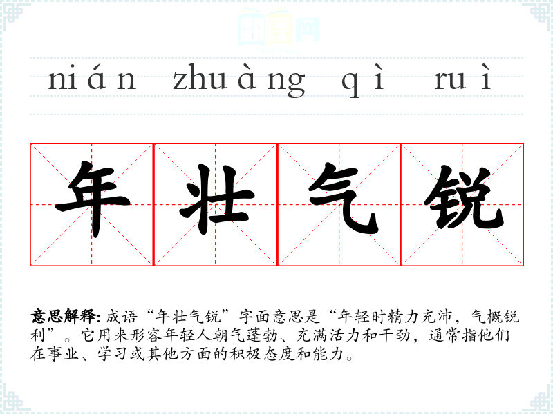 成语“年壮气锐”字面意思是“年轻时精力充沛,气概锐利”。它用来形容年轻人朝气蓬勃、充满活力和干劲,通常指他们在事业、学*或其他方面的积极态度和能力。