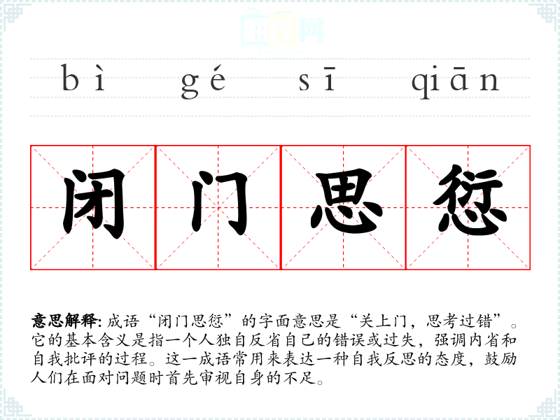 成语“闭门思愆”的字面意思是“关上门,思考过错”。它的基本含义是指一个人独自反省自己的错误或过失,强调内省和自我批评的过程。这一成语常用来表达一种自我反思的态度,鼓励人们在面对问题时首先审视自身的不足。