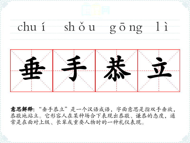 该成语的具体来源并不明确,但可以推测与古代礼仪文化密切相关。在古代,**社会强调尊重与礼节,恭敬待人是维持社会和谐的重要方式。成语中的“垂手”表示一种放松的姿势,而“恭立”则强调了对他人的尊重。