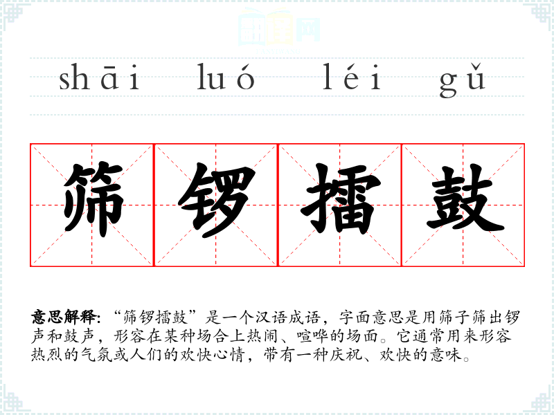 - 文学作品:描述节庆场景时,可以使用“筛锣擂鼓”来渲染气氛。