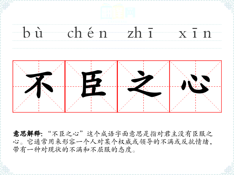 “不臣之心”这个成语字面意思是指对君主没有臣服之心。它通常用来形容一个人对某个权威或领导的不满或反抗情绪,带有一种对现状的不满和不屈服的态度。